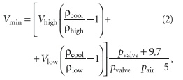 где Vmin — минимальный необходимый объем бака, галлоны; Vhigh — объем жидкости, содержащейся в высокотемпературной зоне системы, галлоны; Vlow — объем жидкости, содержащейся в низкотемпературной зоне системы. галлон; ρcool — плотность жидкости при начальной (холодной) температуре, фунт/фт3; ρhigh — плотность жидкости при максимальной рабочей температуре в высокотемпературной зоне, фунт/фт3; ρlow — плотность жидкости при максимальной рабочей температуре в низкотемпературной зоне системы, фунт/фт3; pair — создание избыточного давления со стороны воздуха расширительного резервуара (см. формулу 3), psig; pvalve — расчетное давление предохранительного клапана (клапан сброса давления) системы отопления, psig: