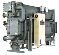Чиллеры компании SANYO безопасны для озонового слоя, поскольку используют идеальный с точки зрения экологии хладагент — воду. Производя охлажденную или горячую воду, чиллеры в качестве источника энергии утилизируют тепло сбросных вод (с температурой 80–95°С), излишки пара или почти полностью сгорающий природный газ. Таким образом, абсорбционные установки SANYO вносят минимальный вклад в образование углекислого газа и, следовательно, во всеобщее потепление. В настоящее время компания SANYO производит абсорбционные чиллеры трех типов (прямого нагрева, парового нагрева и нагрева горячей водой), что позволяет выбрать вариант, наиболее подходящий в соответствии с местными источниками энергии. Для комбинированных систем, вырабатывающих тепло и энергию, как нельзя лучше подходят устройства, использующие в качестве источника энергии тепло сбросных вод с температурой 80–95°С (серия LE). Модельный ряд этих чиллеров состоит из 18 устройств с мощностью в режиме охлаждения от 30 USRT (105 кВт) до 525 USRT (1846 кВт). Расход горячей воды составляет ~0,85 м3/час•RT, максимальное рабочее давление 8 кг/см2.