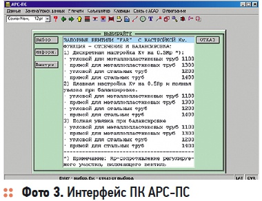 В программный комплекс АРСПС (фото 3) входит значительная часть ассортимента арматуры FAR. Подбор регулирующей и запорной арматуры, реализованный в АРСПС и описанный на сайте разработчика, отличается строгостью и корректностью, а также полному соответствию требований действующих российских СНиП и СП.
