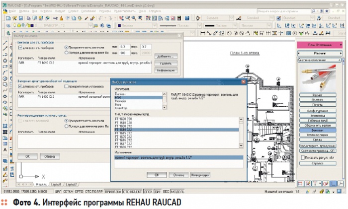 Полный ассортимент вентилей FAR для отопительных приборов доступен в программе REHAU RAUCAD (фото 4). Производится отрисовка схем систем отопления в AutoCAD, включая специальные возможности вычерчивания аксонометрий и автоматический расчет систем отопления с подбором диаметров труб, с гидравлической регулировкой и выбором балансировочной регулировки согласно СНиП. База металлопластиковых труб ограничивается продукцией REHAU, диаметры которых не совпадают с широко известными марками, например, CoesKlima Super K. Так, у трубы RAUTITAN имеется в ассортименте труба с наружным диаметром dн = 16,2 мм и внутренним dв = 11 мм, а аналогичного типоразмера труба CoesKlima Super K имеет dн = 16 мм и dв = 12 мм. Гидравлическое сопротивление этих труб на одном погонном метре отличается в (12/11)5 = 1,55, т.е. в полтора раза. Однако эту трудность можно в программе обойти, изменив в соответствующее число раз длину имеющегося в базе трубопровода REHAU. Все вышеупомянутые программы имеют сертификаты соответствия ГОСТ Р.