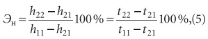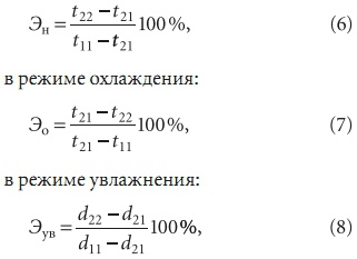 где h21, (t21) — энтальпия (температура) приточного воздуха перед теплообменником; h22, (t22) — энтальпия (температура) приточного воздуха после теплообменника; h11, (t11) — энтальпия (температура) удаляемого воздуха перед теплообменником; h12, (t12) — энтальпия (температура) удаляемого воздуха за теплообменником. Эффективность теплоутилизации вращающихся регенеративных теплообменников определяется по формулам —