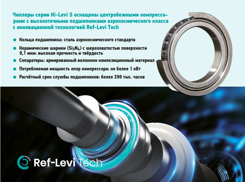 Hisense применяет новаторскую технологию Ref-Levi Tech в высокоточных подшипниках аэрокосмического класса для центробежных компрессоров, обеспечивая скольжение керамических шариков в сепараторах подшипников по тонкому слою газожидкостной суспензии из хладагента (рис. 1). Потребляемая опорами компрессора мощность составляет менее 1 кВт, что значительно меньше энергопотребления обычных подшипников и способствует высокой энергоэффективности чиллеров серии Hi-Levi S.