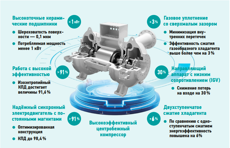Сочетание множества инновационных технологий позволило Hisense создать ультраэффективный центробежный компрессор (рис. 2). Высокоточные керамические подшипники имеют шероховатость поверхности 0,1 мкм, а потребляемая мощность опор составляет менее 1 кВт. Благодаря надёжному синхронному двигателю с постоянными магнитами удалось добиться оптимизированной конструкции с КПД электродвигателя до 98,4%.