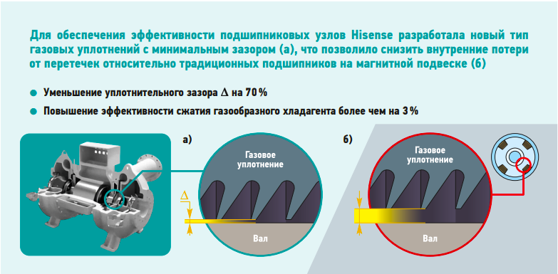 Компания Hisense разработала новый тип газовых уплотнений со сверхмалыми зазорами для снижения потерь от внутренних перетечек. Преимущества по сравнению с традиционными подшипниками на магнитной подвеске очевидны: уменьшение уплотнительного зазора на 70% привело к повышению эффективности сжатия газообразного хладагента более чем на 3% (рис. 3а).
