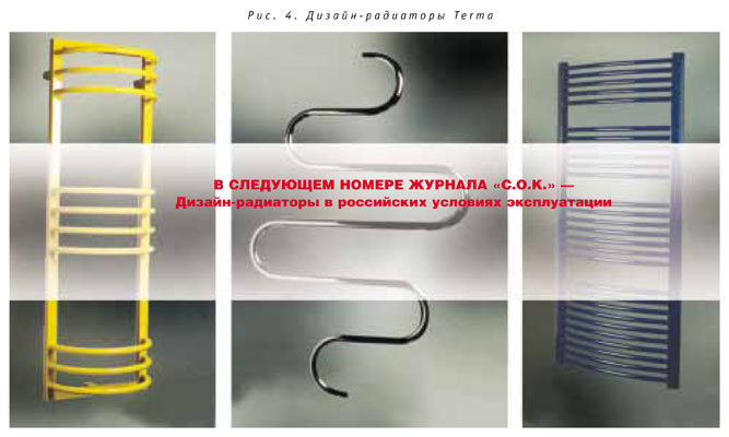 Особенным разнообразием форм и стилевых решений отличаются так называемые «дизайн-радиаторы» или, если говорить проще — полотенцесушители (см. рис. 4). Конечно, радиатор является прежде всего отопительным прибором с конкретными функциональными задачами, поэтому качество и надежность его технических характеристик — первостепенные параметры, элегантный и современный дизайн же может расцениваться как приятное дополнение.