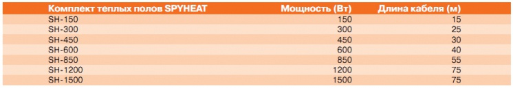 В кабельных системах SPYHEAT используется экранированный кабель с одной нагревательной жилой, в котором экран служит и вторым проводником, подключаемым к нулевому проводу. Такой тип кабеля позволяет использовать его в помещениях с повышенной влажностью, имеет нулевой уровень электромагнитного излучения, удобен при монтаже, и обладает невысокой стоимостью. Для удобства потребителей системы комплектуются всем необходимым и упаковываются в фирменные коробки. Комплекты различаются по мощности нагрева. В состав комплекта входят: нагревательный кабель, стальная монтажная лента, терморегулятор Eltec Electronics с датчиком температуры пола, штатив для монтажа датчика температуры пола, инструкция по монтажу и эксплуатации с гарантийным талоном. Качество продукции подтверждено соответствующими сертификатами РОСТЕСТа Российской Федерации. Гарантия на нагревательный кабель составляет 17 лет, на терморегулятор — 2 года. По результатам испытаний срок службы нагревательного кабеля составляет не менее 25 лет. Достоинствами предлагаемого нагревательного кабеля являются:
