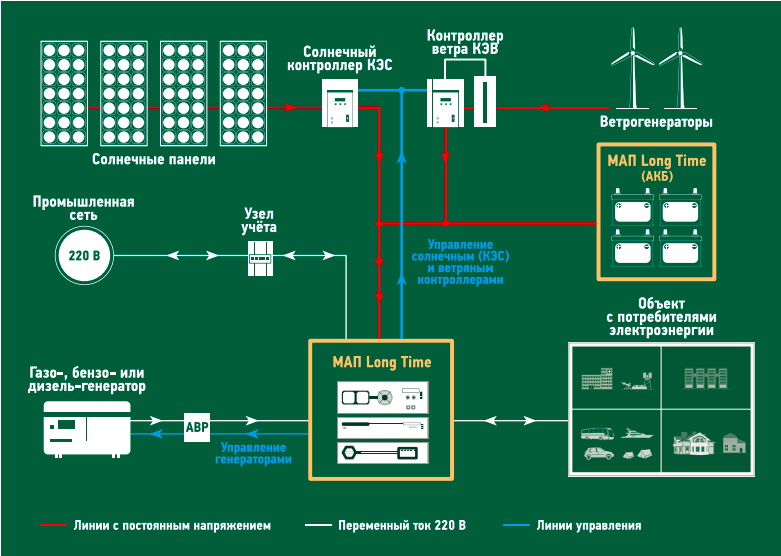 Рис. 1. Принципиальная схема гибридной солнечно-ветряной электростанции