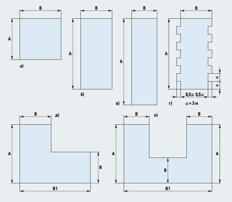 Наименьшее значение отношения P/F у здания (табл. 2), имеющего форму квадрата (рис. 1а), а наибольшее — у здания, имеющего прямоугольную форму и ломаный фасад (рис. 1в, 1г). Это означает, что при той или другой форме здание с одинаковой общей площадью может иметь разные площади вертикальных наружных ограждений, пропорциональные их периметру и, следовательно, разные расчётные тепловые потери и тепловую мощность системы отопления, которые могут отличаться на 75% и более.