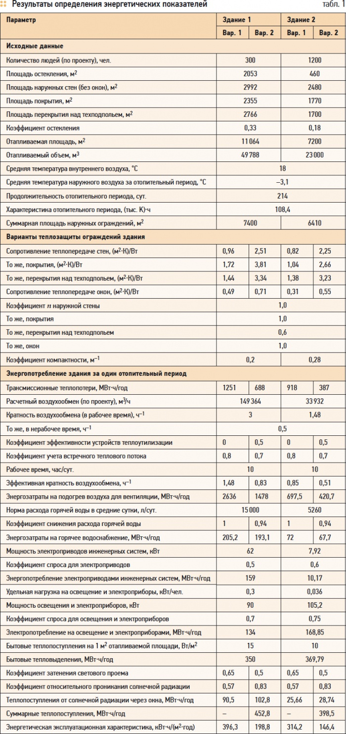 В случае, если расчетная мощность бытовых теплопоступлений оказывается менее 10 Вт/м2, для дальнейших вычислений используется величина 10 Вт/м2.Следует, однако, иметь в виду, что при определении энергетической эксплуатационной характеристики теплопоступления в первом варианте не учитываются, т.к. предполагается отсутствие индивидуального автоматического регулирования теплоотдачи системы отопления. В табл. 1 приведены результаты расчета энергетических показателей рассматриваемых зданий, а в табл. 2 — сравнительная эффективность энергосберегающих мероприятий, т.е. абсолютное и относительное снижение энергопотребления. Необходимые справочные данные по температурам внутреннего воздуха, кратности воздухообмена в рабочее время, расходу горячей воды и потреблению электроэнергии приняты по