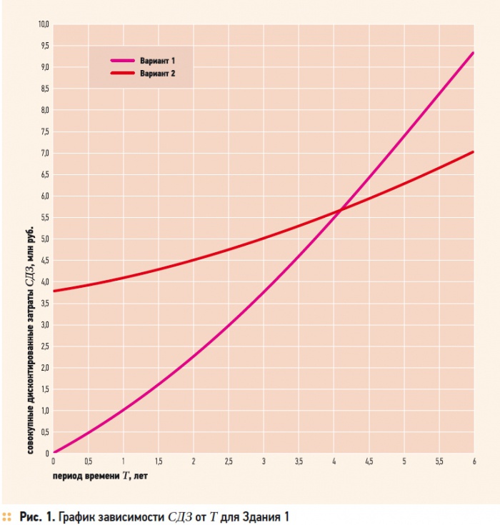 Вычисление СДЗ по вариантам в зависимости от горизонта расчета Т, т.е. промежутка времени с момента ввода здания в эксплуатацию, производилось с учетом действующих цен на материалы и оборудование, в т.ч. упомянутых выше при оценке требуемой теплозащиты ограждений, и стоимости тепловой энергии, отпускаемой ОАО «Мосэнерго», равной 620 руб/Гкал по данным на 2007 г. с использованием методики, приведенной в работе [11] и использованной затем в [2]. При этом норма дисконта была принята равной ставке рефинансирования ЦБ РФ, действующей с середины 2006 г., или 11,5 % годовых. Результаты расчетов для Здания 1 приведены на рис. 1. Легко видеть, что ожидаемый срок окупаемости всего использованного комплекса энергосберегающих мероприятий даже с учетом дисконтирования затрат составляет всего около 4,1 года, что намного меньше расчетного срока службы здания (порядка 50 лет). Практически такие же данные получаются и для Здания 2. Здесь окупаемость будет иметь место примерно через 3,4 года.