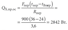 В рассматриваемом выставочном зале трансмиссионные теплопоступления имеют место только через наружное перекрытие, термическое сопротивление которого составляет Rпер = 3,8 (м2⋅ °C)/Вт. Температуру при наличии солнечной радиации на наружной поверхности перекрытия принимаем tпер = 36 °C, а температуру воздуха под перекрытием tВпер = 24 °C. Тогда трансмиссионные теплопотери: