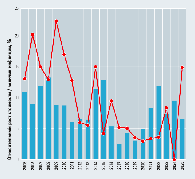 Рис. 2. Относительный рост стоимости тепловой энергии для населения в Санкт-Петербурге и ежегодная инфляция за 2005–2025 годы