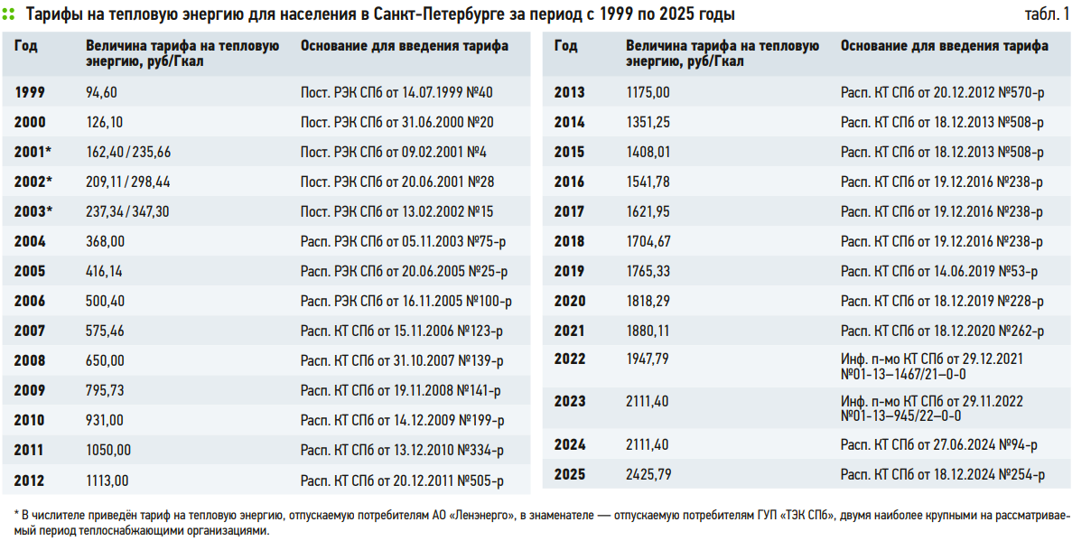В табл. 1 приведены тарифы на тепловую энергию в Санкт-Петербурге, определяющие плату для населения за коммунальные услуги по отоплению и горячему водоснабжению, а также ссылки на соответствующие правовые акты.