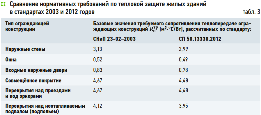 Эти изменения автоматически отразились на базовых значениях требуемых сопротивлений теплопередаче ограждающих конструкций, представленных в табл. 3, из которой следует, что в своде правил по тепловой защите зданий 2012 года по всем наружным ограждениям нормативные показатели оказались ниже принятых в стандарте 2003 года.
