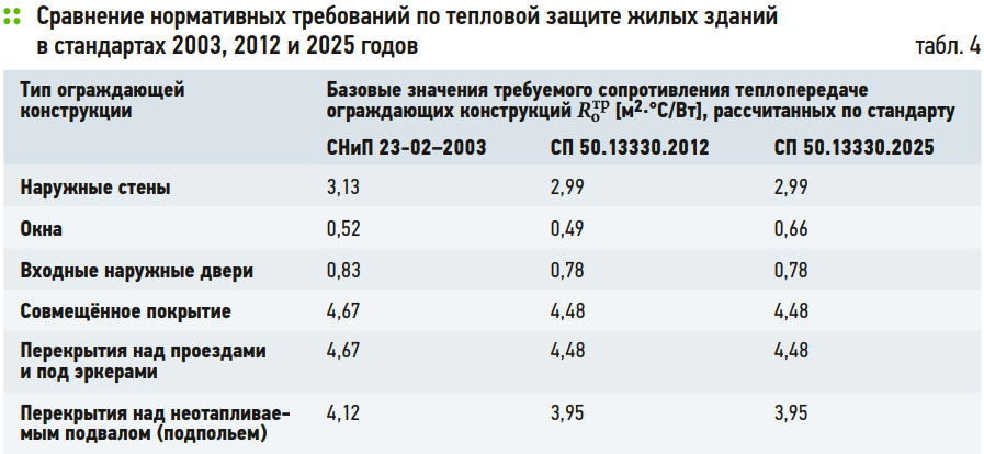Объективности ради следует отметить, что в 2020 году были увеличены нормативные требования в отношении окон (табл. 4). Но площадь окон занимает незначительную часть общей площади наружных ограждений. В частности, в примере расчёта удельной теплозащитной характеристики здания по Приложению К СП 50.13330.2025 (табл. К. 1) суммарная площадь наружных ограждающих конструкций рассматриваемого многоэтажного жилого дома составляет 12415 м², а площадь окон — 1813 м², то есть менее 15% от общей площади наружных ограждений.