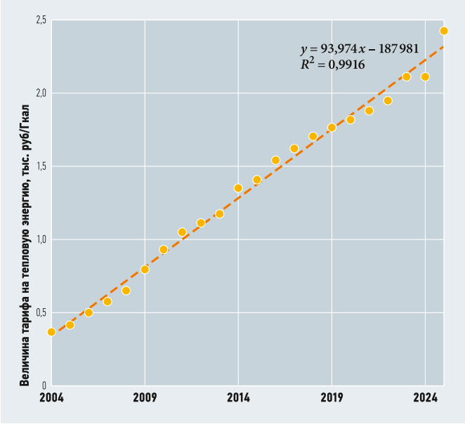 Исключим из рассмотрения первые пять лет указанного выше периода. И рассмотрим динамику изменения тарифа на тепловую энергию за период с 2004 по 2025 годы (рис. 1), из которой следует, что за отмеченный период тариф вырос в 6,59 раза (на 559%). При этом после 2004 года зависимость остаётся практически линейной (статистический показатель — коэффициент детерминации R2 превышает 0,99), то есть закономерно отражает выявленный тренд.