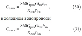 где Qpгв, Qpхв — расчетные расходы холодной и горячей воды [м3/с], подаваемой по водопроводам; σ — сметная стоимость 1 кВт⋅ч электроэнергии [руб.], используемой для перекачки воды насосами; lгв и lхв — длина горячего и холодного водопроводов, м; h — потери напора [м/м], которые должны определяться путем гидравлического расчета горячего и холодного водопроводов [5, 6]; Ксгв и Ксхв — коэффициенты, учитывающие сезонные перерывы в работе для горячего водопровода (продолжительность ремонта, которая порой длится более месяца) и холодного водопровода; ηгв и ηхв — КПД насосов, обслуживающих системы горячего и холодного водоснабжения.
