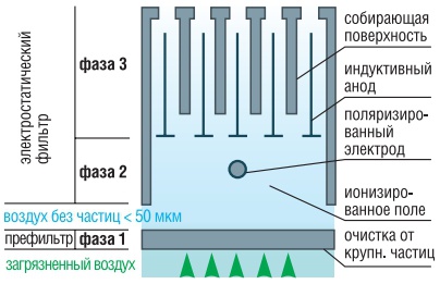 - фаза 3— окончательная очистка воздуха, частицы притягиваются к сборным пластинам сильным индукционным магнитным полем (см. рисунок).