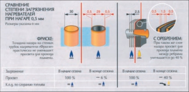 3. Устойчивый КПД, что обеспечивается шириной просвета 30 мм в нагревателе Фриске (эта ширина в нагревателях с оребрением может уменьшиться до 2,5 мм при стандартных эксплуатационных загрязнениях).