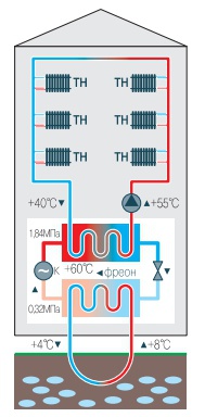В случае работы на обогрев, тепловой насос, как обычный холодильник, с помощью компрессора и хладагента аккумулирует это тепло и передает его внутреннему контуру, повышая температуру воды в нем до 50–55°С. В случае работы в кондиционном режиме, или при избытке тепла внутри здания, происходит обратный процесс, и избыточное тепло сбрасывается во внешний контур.