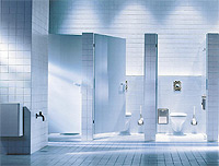 Вторым, обязательным гигиеническим мероприятием является регулярная дезинфекция как самих помещений общественных туалетов хлорсодержащими растворами, так и дезинфекция воды в трубопроводных системах всего здания. Наиболее рационально для упрощения уборки напольного пространства туалетных комнат является использование подвесной сантехники, при которой унитазы крепятся к стене. Для подвесных керамических унитазов различных фирм-изготовителей компания Grohe производит запатентованные металло-каркасные монтажные рамы Rapid - так называемые "системы инсталляции". Эти рамы выдерживают нагрузку не менее 400 кг - при увеличении нагрузки свыше этой цифры разрушается керамическая основа унитазов.
