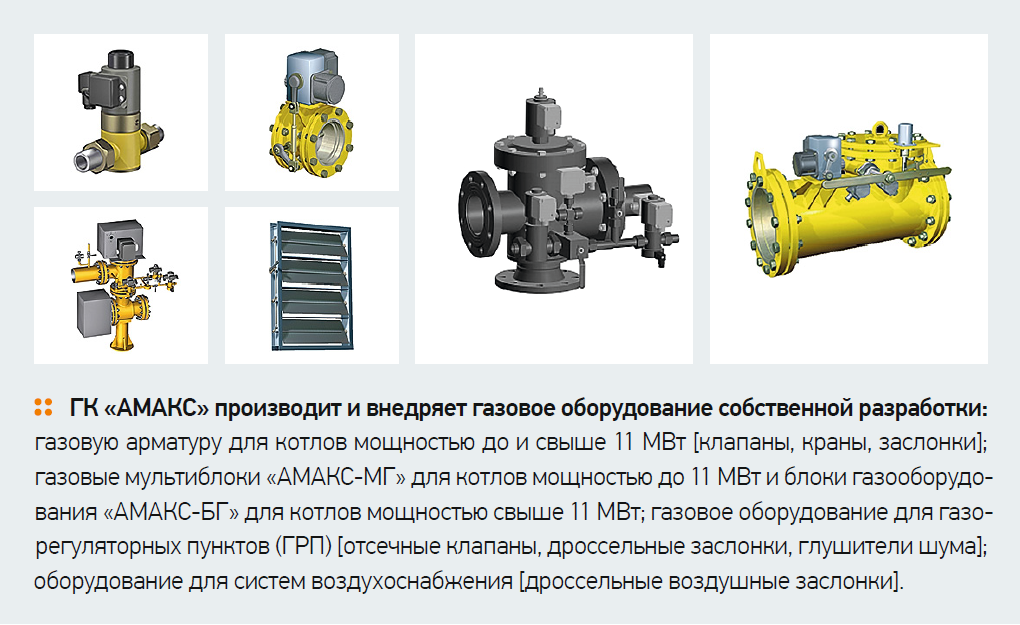 ГК «АМАКС» производит и внедряет газовое оборудование собственной разработки: газовую арматуру для котлов мощностью до и свыше 11 МВт [клапаны, краны, заслонки]; газовые мультиблоки «АМАКС-МГ» для котлов мощностью до 11 МВт и блоки газооборудования «АМАКС-БГ» для котлов мощностью свыше 11 МВт; газовое оборудование для газорегуляторных пунктов (ГРП) [отсечные клапаны, дроссельные заслонки, глушители шума]; оборудование для систем воздухоснабжения [дроссельные воздушные заслонки].