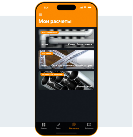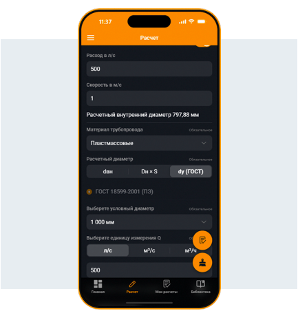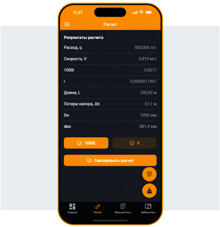В результате разработки и тестирования приложения получился продукт, отвечающий вышеописанным критериям и объединяющий в себе простоту использования с гибким функционалом, включая возможность выбора различных материалов трубопроводов, учёт их характеристик и автоматизированный расчёт потерь напора на участках водопроводной сети. Визуально привлекательный и интуитивно понятный интерфейс прост в освоении и удобен. На рис. 4 и 5 представлена вкладка приложения «Расчёт».