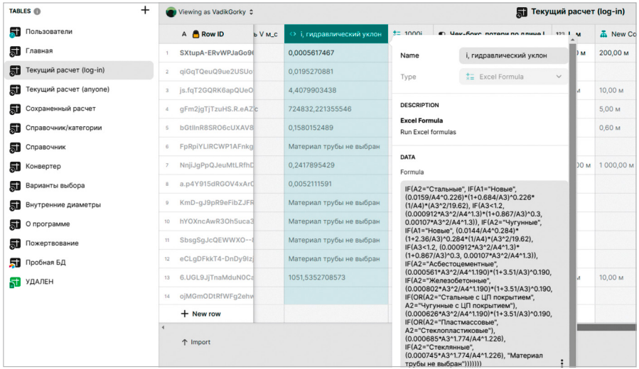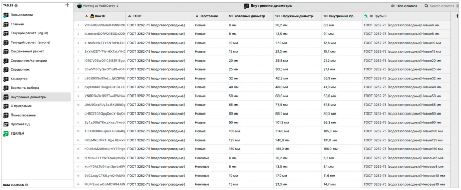 Следующим шагом является создание базы данных, которая будет хранить всю необходимую информацию об основных и промежуточных расчётах, данные о характеристиках трубопроводов (материал, диаметры, состояние) (рис. 1), справочные материалы, а также данные пользователей (электронная почта и имя).