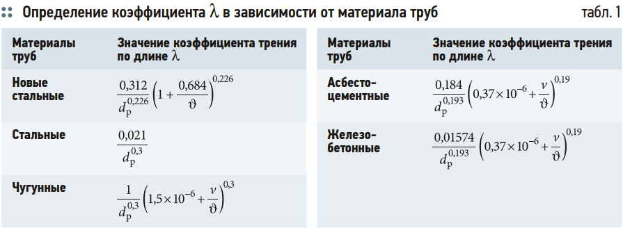 Для использования формулы необходимо определить значения коэффициента λ для труб из различных материалов и принять расчётные величины диаметров. Диаметры для труб из различных материалов выбираются согласно ГОСТам или принимаются проектировщиком в зависимости от исходных данных. В табл. 1 представлены формулы для расчёта коэффициента λ для некоторых материалов труб.
