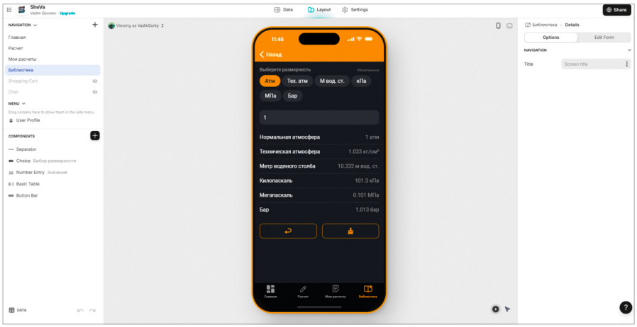 На рис. 3 представлен процесс сборки экрана «Конвертер» в визуальном редакторе платформы Glide.