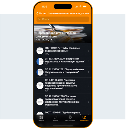 Реализация в приложении таких возможностей, как сохранённые расчёты и доступ к нормативно-технической литературе, показана на рис. 6 и 7.