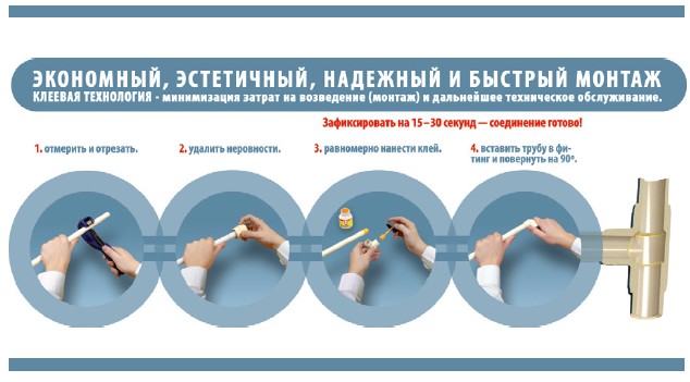 Особое внимание следует обратить на простой, недорогой и точный монтаж трубопроводов из ХПВХ, который осуществляется методом клеевого соединения и, в отличие от других полимерных материалов, не требует использования дорогостоящего оборудования и профессиональных навыков монтажника. Клей здесь работает как ≪временный≫ растворитель материала, образуя монолитное соединение, что обеспечивает высочайшую герметичность.