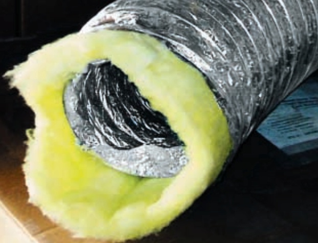 5. Утеплитель. В утепленных и звукопоглощающих воздуховодах «Диафлекс» используется высококачественная стекловата американского производства, плотностью 12 кг/м3 при толщине 25 мм. Коэффициент ее термического сопротивления — 0,6 К•м2/Вт. Как правило, в отрасли используется аналогичный утеплитель с плотностью от 10 до 16 кг/м3.