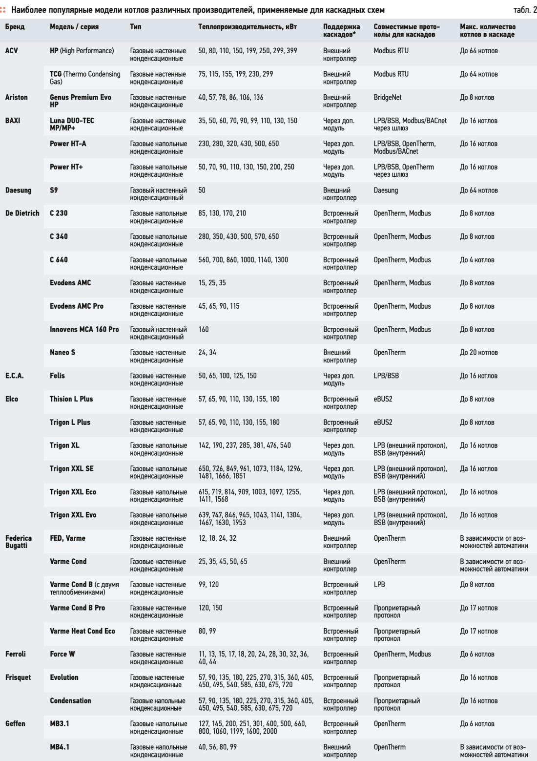 В табл. 2 мы попытались собрать наиболее популярные модели котлов различных отечественных и зарубежных производителей, применяемые для каскадных схем.