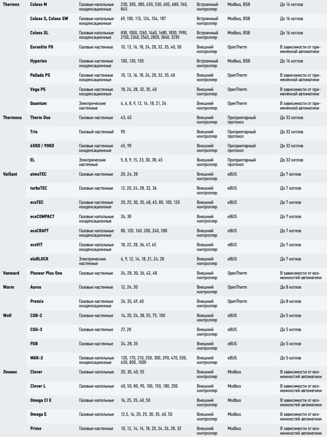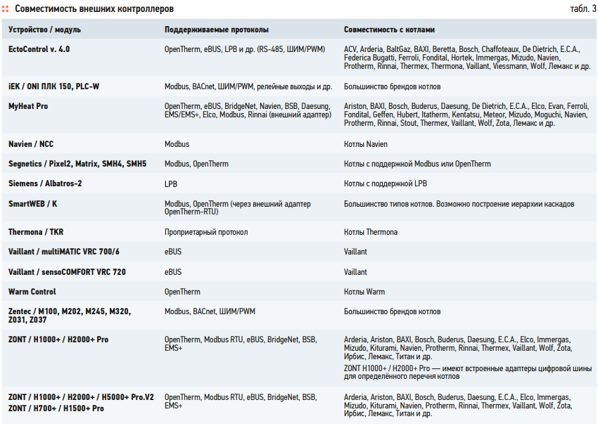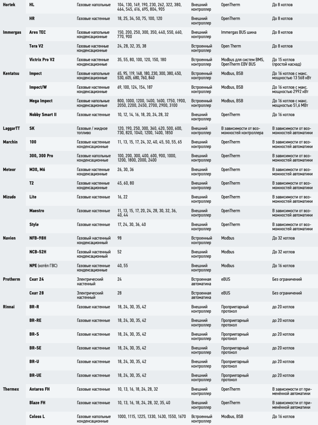 Если со встроенной автоматикой всё достаточно просто, так как производители предусмотрели в автоматике возможность работы своих котлов в каскадах, то при подборе внешних контроллеров нужно учитывать их совместимость с котлами, которая определяется поддержкой соответствующих протоколов и спецификациями оборудования (табл. 3). Ниже приведён обзор основных протоколов управления.