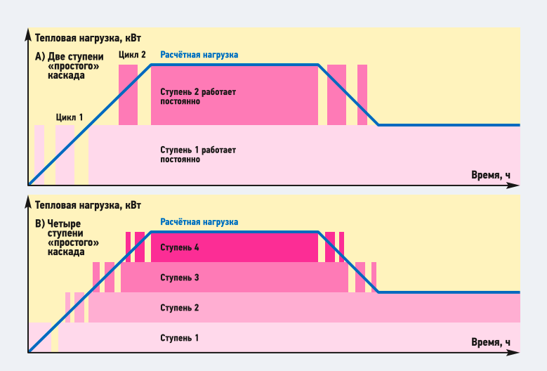 На рис. 1 приведены эксплуатационные характеристики двух типов каскадных систем по отношению к расчётной диаграмме нагрузки. Первая система состоит из двух котлов, оснащённых одноступенчатыми горелками, каждый из которых рассчитан на покрытие 50% проектной тепловой нагрузки. Вторая система включает четыре котла с аналогичными горелками, причём каждый агрегат способен обеспечить 25% расчётной нагрузки.