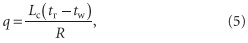 в которую входят величина теплового потока q, длина скважин Lc, температуры грунта в естественном состоянии tг и жидкости, циркулирующей в ВГТ tw, а также линейное (отнесенное к одному метру длины скважины) сопротивление теплопередаче R от грунта к жидкости.