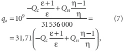 где Qc — годовая потребность в холоде, ГДж; Qн — годовая потребность в тепле, ГДж; 31 536 000 — количество секунд в году; и — холодильный коэффициент и коэффициент преобразования теплового насоса, определяемые по каталогам оборудования при расчетных температурах кипения и конденсации холодильного агента.