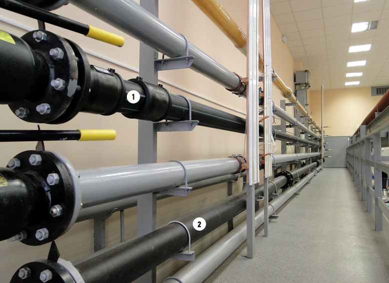 Фото 1. Крупногабаритный гидравлический стенд с пьезометрами и пятью трубами [1 — ПЭ-100 SDR 17 (110×6,6) по ГОСТ 18599–2001 условным диаметром 100 мм; 2 — труба ВЧШГ условным проходом 100 мм по ТУ 1461–037–50254094–2008]