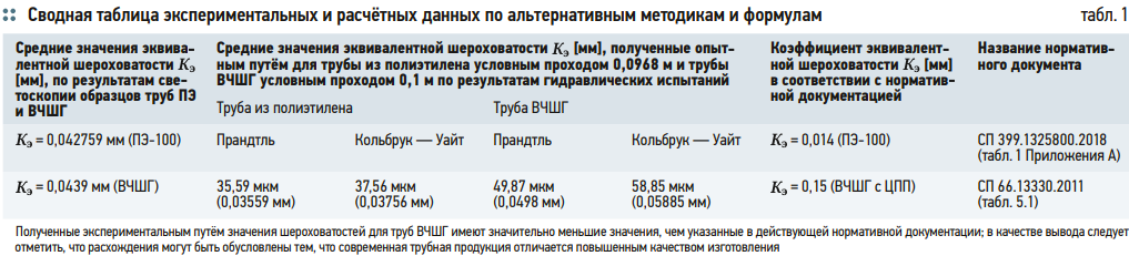 1. В результате проведения экспериментальных гидравлических исследований труб из ВЧШГ и ПЭ-100 с параллельным проведением сравнительного анализа путём сопоставления результатов стендовых испытаний с результатами оптического контрастирования получены значения эквивалентной шероховатости Кэ.