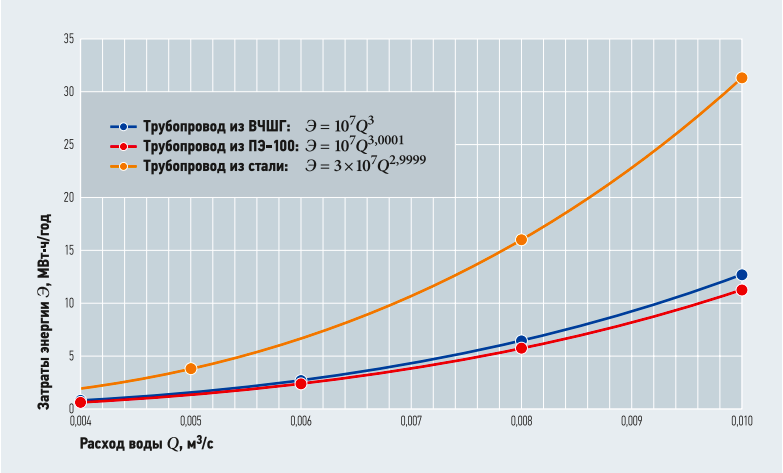 В отношении возможного увеличения гидравлического сопротивления во времени и тем самым роста энергозатрат на транспортировку воды по напорным трубопроводам из ВЧШГ и ПЭ-100 необходимо отметить следующее: коэффициенты гидравлического сопротивления данных труб приняты неизменными в сравнении со стальными трубопроводами, что доказывает длительная практика их применения [9].