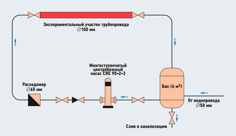 Гидравлические исследования проведены в Лаборатории кафедры водоснабжения и водоотведения НИУ «МГСУ» по стандартной методике НИИ «ВОДГЕО». Работа на гидравлическом стенде осуществлялась по замкнутой системе с забором воды из накопительной ёмкости, заполняемой питьевой водой, подачи её к трубопроводам насосом Grundfos марки CRE90–2-2 с частотным регулированием и с последующим сливом в накопительную ёмкость. В начале и конце рабочего участка длиной 10 м производились замеры статических давлений по соответствующим пьезометрам и фиксировался расход с помощью ультразвукового расходомера US-800 с электронным табло.