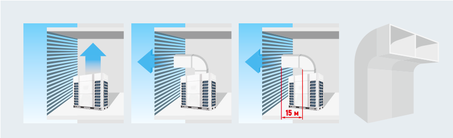 Высокое изменяемое свободное статическое давление вентилятора позволяет устанавливать наружные блоки на технических этажах или в помещениях.
