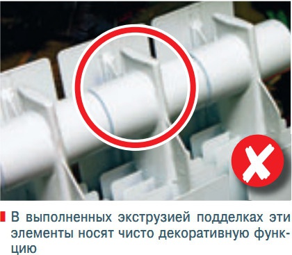 В противовес настоящему алюминиевому радиатору Royal Thermo, подозрительный прибор явно не литой, а экструзионный. Литье под давлением, в процессе которого расплавленный металл со строго определенной скоростью распределяется в стальной форме, позволяет получить цельные секции сложной конфигурации с тонкостенным оребрением. Это гарантирует точное соблюдение всех геометрических размеров, гладкую поверхность и весьма высокую однородность материала по всему объему секции. Но наш «подозреваемый» выполнен явно методом экструзии, т.е. фактически «выдавлен» через форму, причем по частям. Спору нет, экструдированные радиаторы имеют право на существование — но только не в этом случае. Отсутствие должной коррозийной защиты заметно сужает допустимый диапазон pH теплоносителя — попросту говоря, щелочная или кислая вода сможет натворить немало бед, разъедая радиатор изнутри. При этом крайне тонкие (скорее даже хлипкие) стенки оребрения горе-радиатора особенной прочностью не блещут — чтобы убедиться в этом, достаточно приложить одну вовсе не богатырскую силу и послушать предательский треск. Конечно, вряд ли вы соберетесь целенаправленно ломать уже установленный радиатор, но для надлома нижней части оребрения может оказаться достаточно пары случайных ударов теми же ножками мебели. А трещины и рваные края алюминиевого полотна мало того что неэстетичны — они еще и травмоопасны и оставляют крайне неприятные резаные раны. К слову, настоящему Royal Thermo так вот запросто ребер не сломать, да и не запросто тоже.
