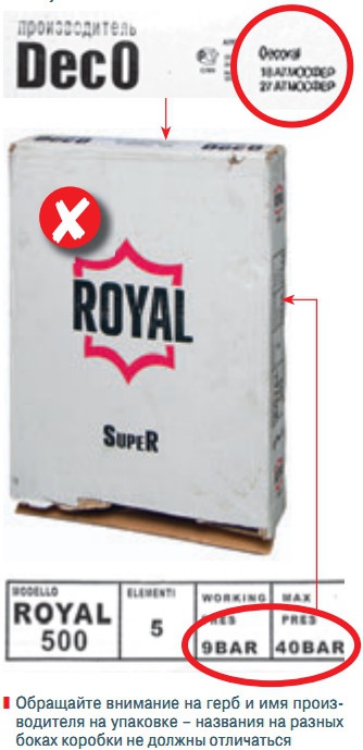 И, наконец, в коробке с гербом, очень похожим на оригинальную эмблему Royal Thermo, не обнаруживается ни гарантийного талона, ни какого-либо другого документа, позволяющего в случае возникновения любого из вышеописанных бедствий идентифицировать виновника и предъявить ему претензии. Купленный на рынке, такой прибор становится настоящим «котом в мешке» — совершенно непонятно, чего от него ждать, но точно известно, что ликвидировать последствия придется собственнымисилами и за свой счет, не надеясь ни на какую компенсацию. И, что самое обидное, обойдется такая сомнительная покупка если и дешевле «законопослушного» радиатора Royal Thermo, то совсем ненамного.