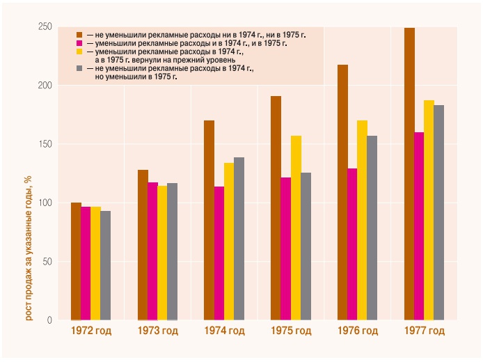 Теоретические рассуждения подтверждают многочисленные исследования. Например, по результатам затяжного кризиса в США в 1974–1975 гг. оказалось (см. график), что сохранение на время рецессии рекламного бюджета на прежнем, докризисном уровне или его увеличение привело к стабильному росту продаж даже во время общего упадка, не говоря уже о послекризисных годах.