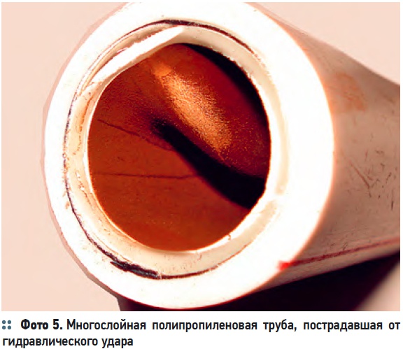 6. Особую опасность для квартирных трубопроводов, выполненных из многослойных труб, представляет зона разряжения ударной волны при гидравлическом ударе. При клеевом слое низкого качества или наличии непроклеенных участков, образующийся в трубе вакуум отрывает внутренний слой трубы, заставляя его «схлопываться» (фото 5, 6).