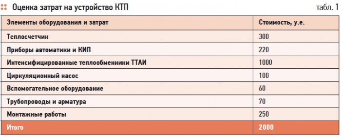 Оценка стоимости затрат на тепловой пункт одной квартиры, тепловые мощности которой составляют 4,6 кВт по отоплению и 19 кВт по горячему водоснабжению (рис. 1) приведена в табл. 1.