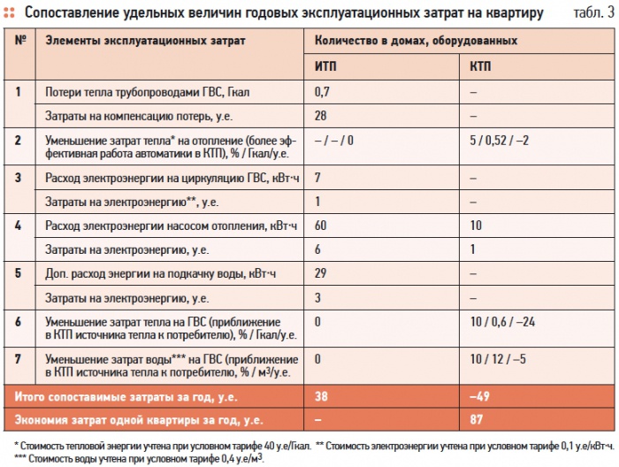 Несмотря на то, что не все из перечисленных факторов повышенной эксплуатационной эффективности могут быть вполне достоверно оценены количественно, в табл. 3 выполнена ориентировочная их оценка. При ежегодной экономии 87 у.е. на каждой квартире дополнительные затраты, связанные с устройством КТП, окупятся примерно за 5 лет.