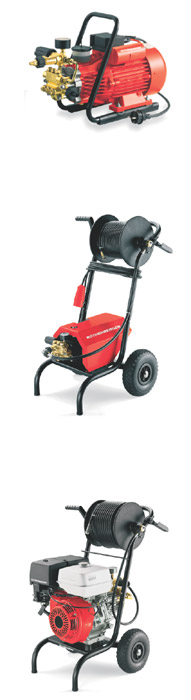 Существуют модели с питанием от сети 220В, 380В, а так же с автономным бензиновым двигателем. Все машины выполнены в виде тележек с пневматическими шинами. Простота в обслуживании позволяет работать с машиной одному оператору. Забор воды производится из системы водоснабжения или из любого резервуара самовсасыванием. Оператор лишь стравливает шланг с барабана, а насадка сама продвигается в трубе, проходит отводы, очищает стенки трубы и размывает засор.